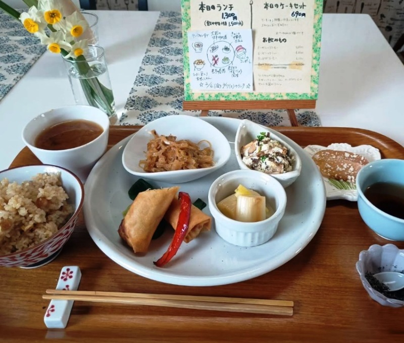 <ランチメニュー> ・今週のランチ 1,300円 ・今週のランチ + 飲み物つき 1,500円 <喫茶メニュー> ・今週のケーキ 380円 ・今週のケーキ + 飲み物つき 690円 ・OG珈琲,紅茶,たんぽぽ珈琲 420円